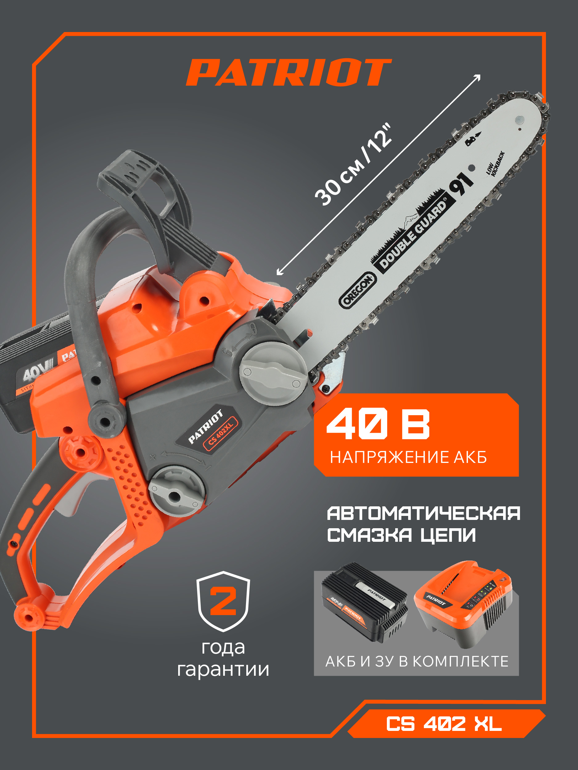 СS 402XL – легкая аккумуляторная цепная пила с металлическим упором предназначена для пиления древесины и заготовки дров на зиму. Установка, замена и натяжение цепи происходят без дополнительных инструментов с помощью двух больших маховиков. Для запуска пилы необходимо зажать кнопку предохранителя и клавишу старта – защита от случайного пуска. Во время работы амортизатор верхней рукоятки подавляет вибрации. Цепь смазывается автоматически, а уровень масла можно контролировать через смотровое окно. Бесщеточный двигатель обладает высоким КПД, крутящим моментом и долгим сроком службы. Пила оснащена инерционным защитным тормозом цепи. В комплекте пильная шина OREGON, аккумулятор BL402 и зарядное устройство GL402.