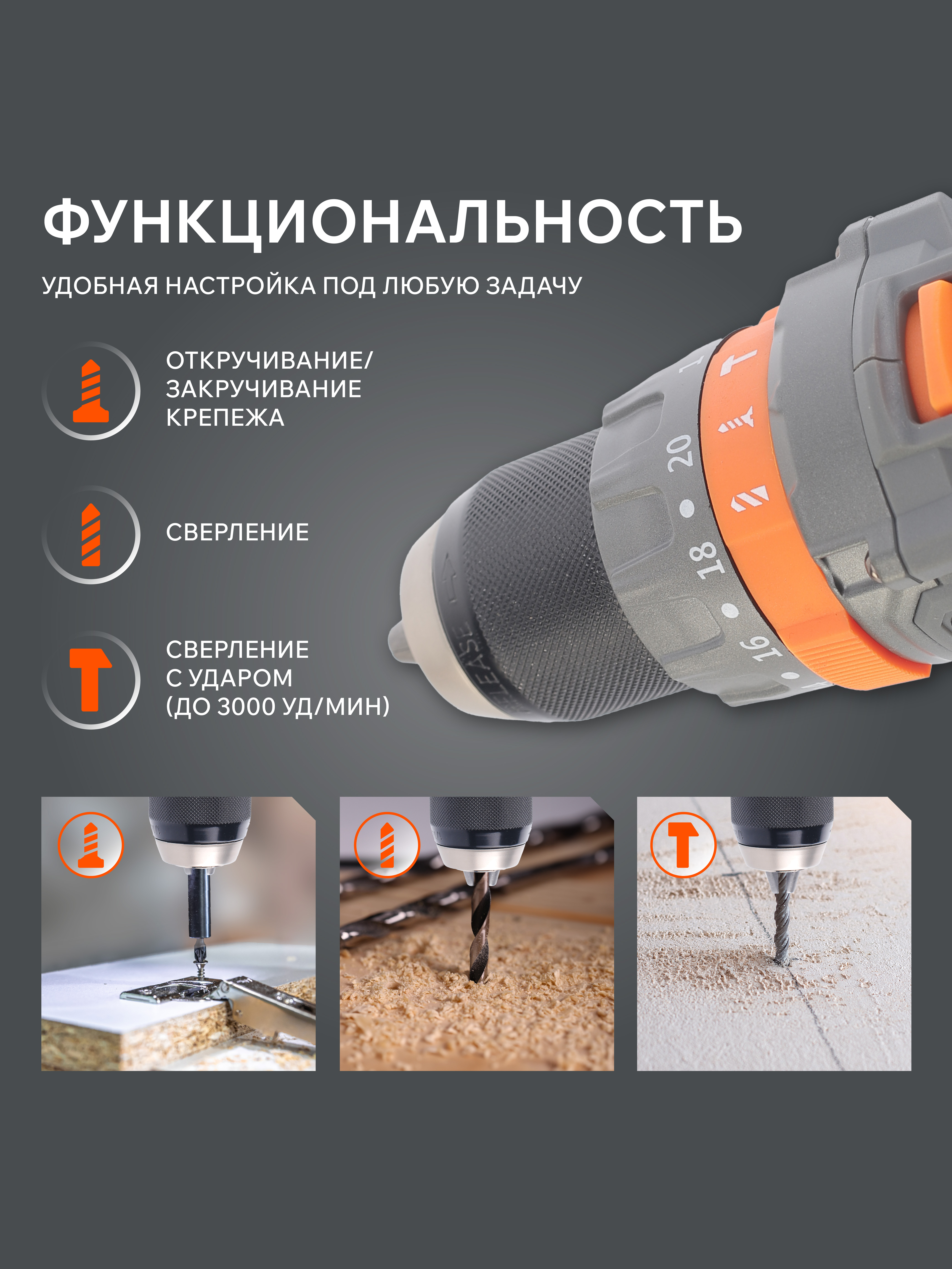 Дрель-шуруповерт BR 214 UES предназначена для монтажных работ, сверления и работы с крепежом в различных материалах. Оснащена бесщеточным двигателем с крутящим моментом до 85 Нм (жесткий) и 50 Нм (мягкий), одинаковым в обоих направлениях. Двухскоростной редуктор с металлическими шестернями обеспечивает 570 / 2000 об/мин, а режим удара — до 30 000 ударов в минуту. Доступен импульсный и турбо-режим. Инструмент имеет 20+1 ступеней регулировки момента, быстрозажимной патрон на 13 мм, реверс, блокировку шпинделя, плавный пуск и защиту от перегрузок. Светодиодная подсветка улучшает видимость, а прорезиненная рукоятка и скоба на пояс повышают удобство. Защитная функция KickBack Control отключает двигатель при заклинивании бура, чтобы предотвратить резкий рывок и снизить риск травмы.