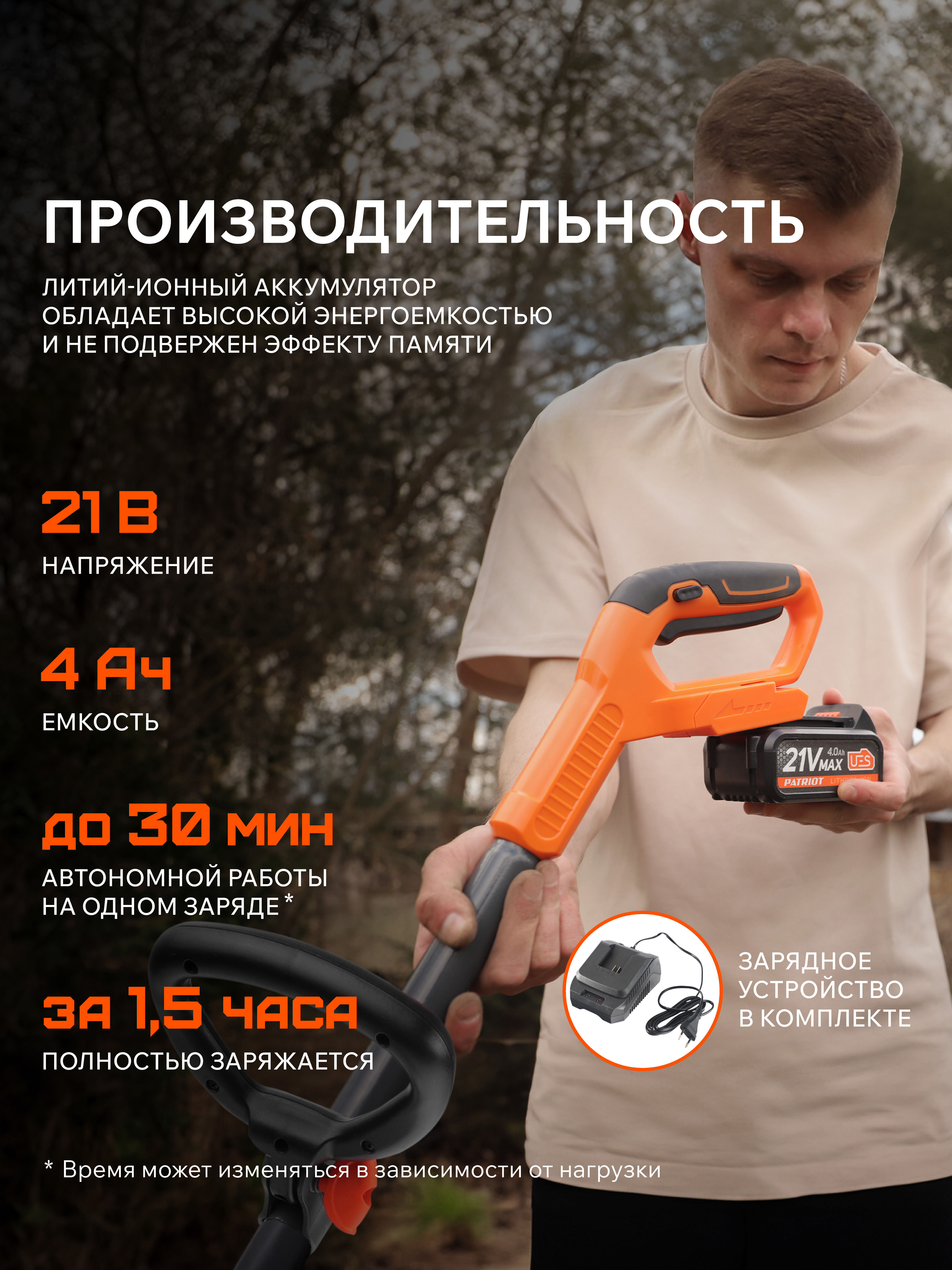 Работает от литий-ионного аккумулятора с напряжением 21В MAX, поставляется в комплекте с АКБ серии UES емкостью 4 А⋅ч. Это обеспечивает тихую работу без выхлопных газов в любой точке участка. Полного заряда хватает до 30 минут работы. Зависит от емкости аккумулятора, степени заряда, почвы.
