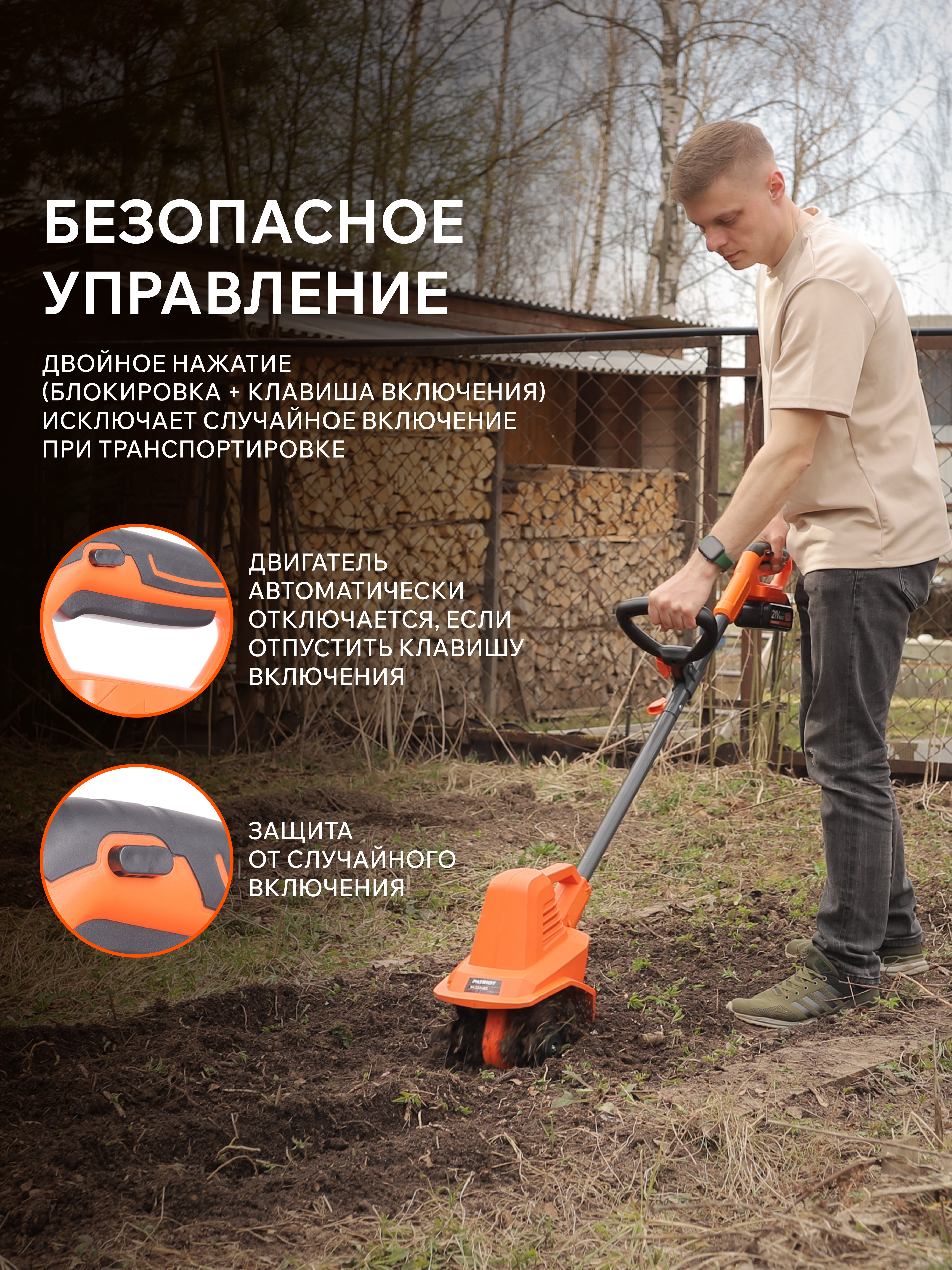 Эффективное охлаждение двигателя за счет циркуляции воздуха. Отсутствие выхлопа и низкий уровень шума для работы закрытых помещениях. Кнопка защиты от произвольного включения на рукоятке для безопасности оператора. Пластиковые крылья защищают от разлета земли. Небольшие габариты и вес 4,4 кг придают маневренность.