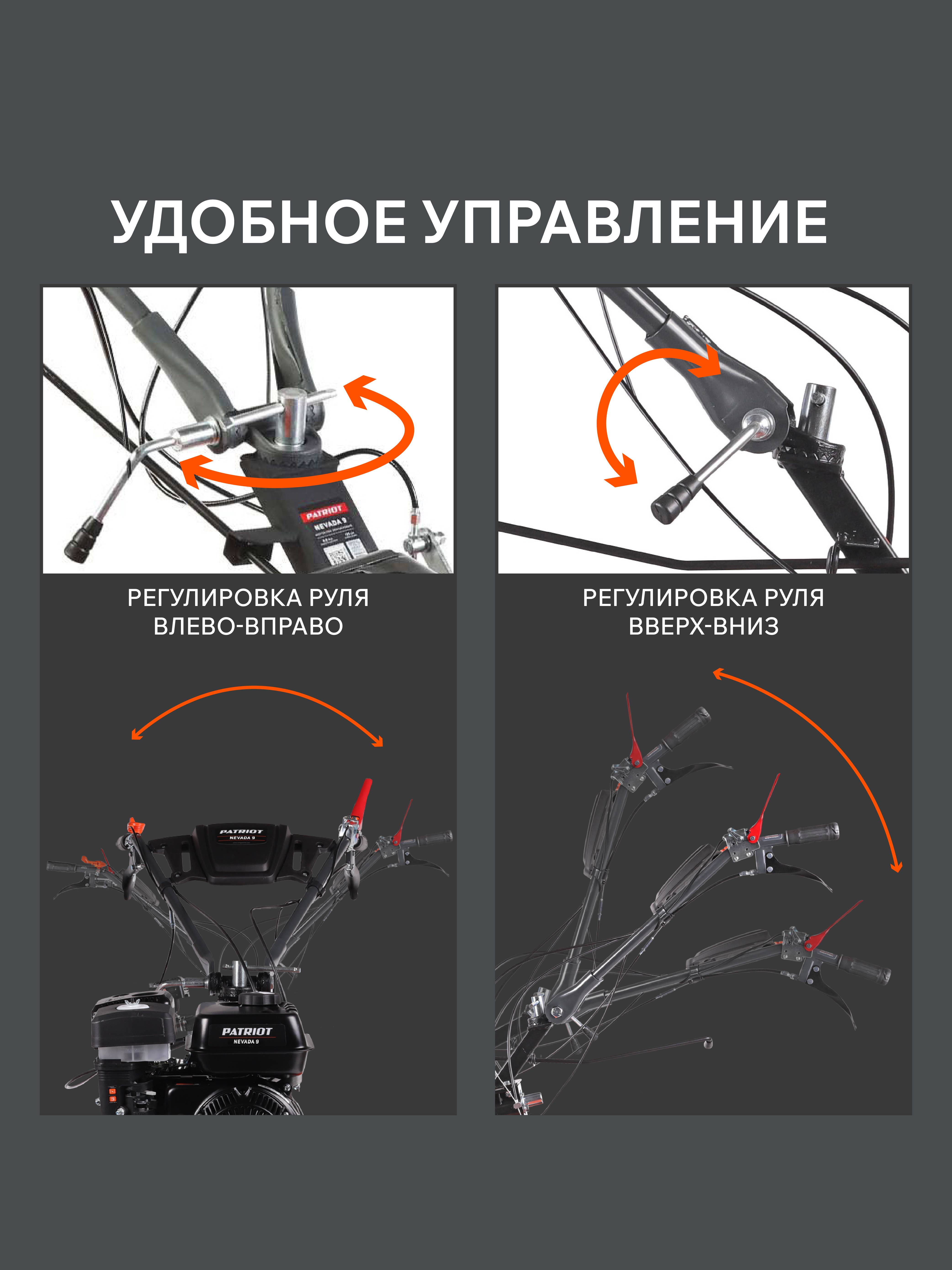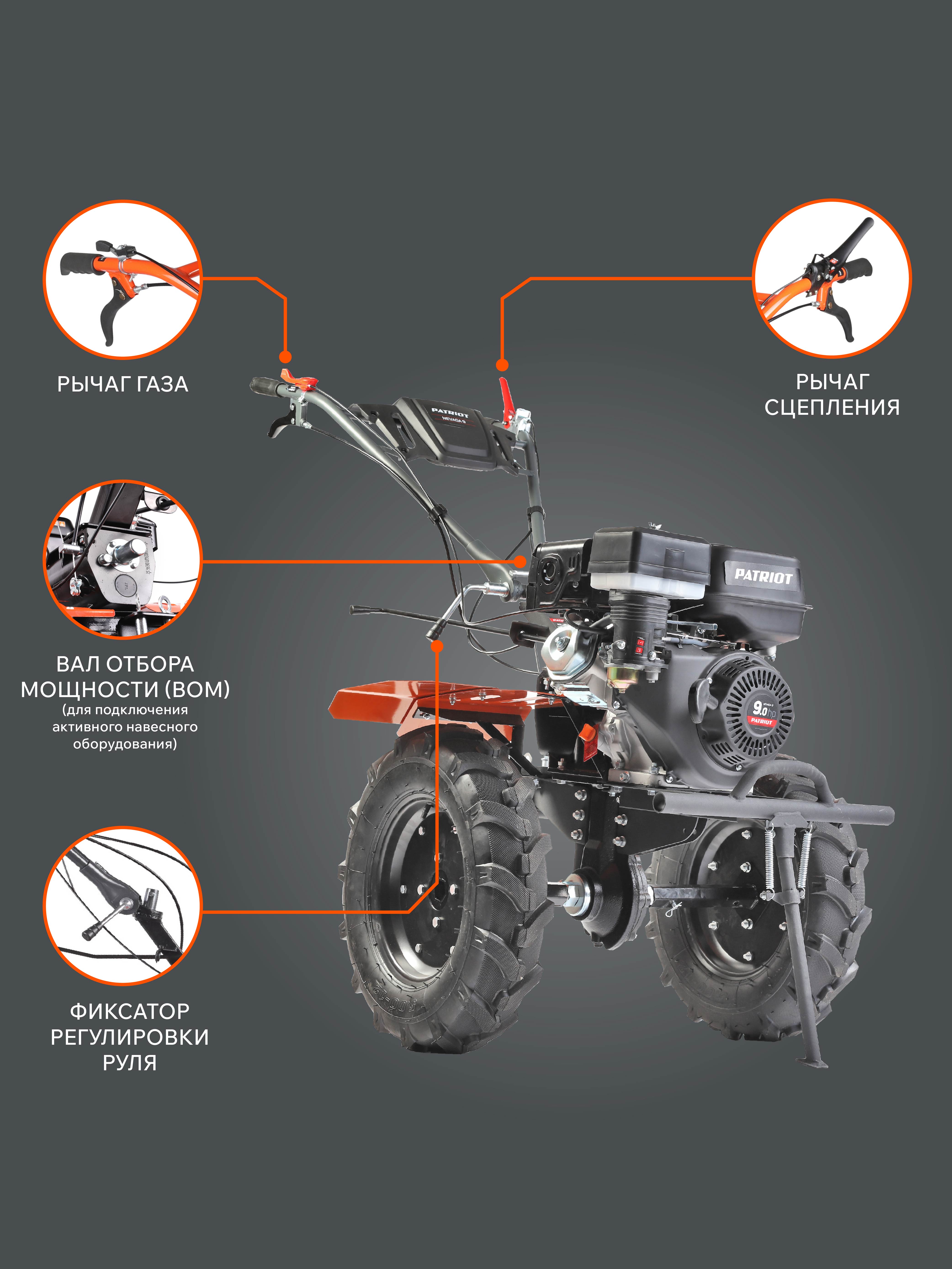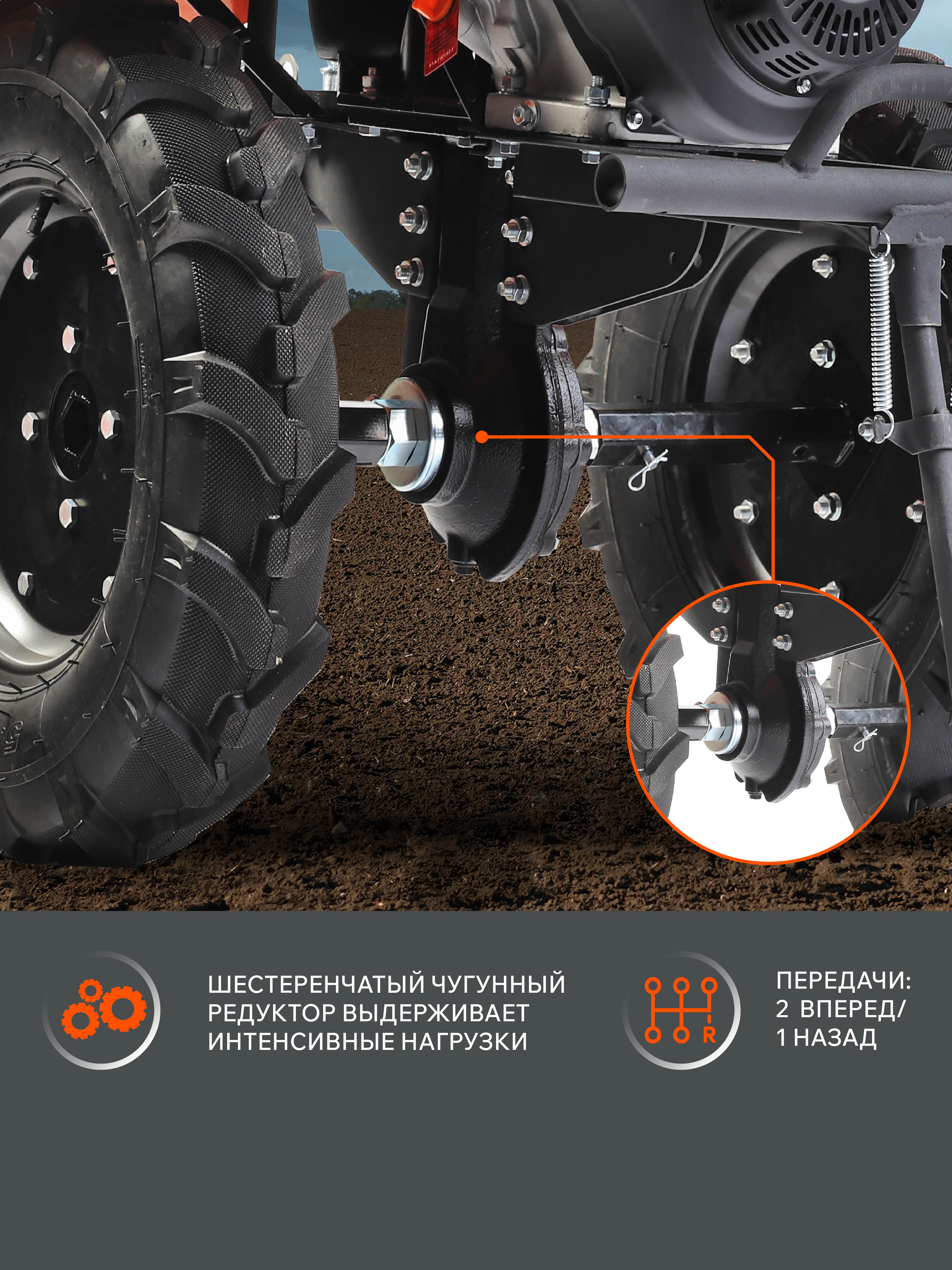 Чугунный шестеренчатый редуктор обеспечивает надежность и точность передачи. Система воздушного охлаждения с поролоновым фильтром защищает от пыли и песка. Крепкие ручки и усиленная рама делают мотоблок подходящим для тяжелых задач. Руль оснащен кнопкой включения, рукояткой газа, рычагами привода и кейсом для ключей, его наклон регулируется. Шины с рельефным протектором из высококачественной резины для надежного сцепления с грунтом.
