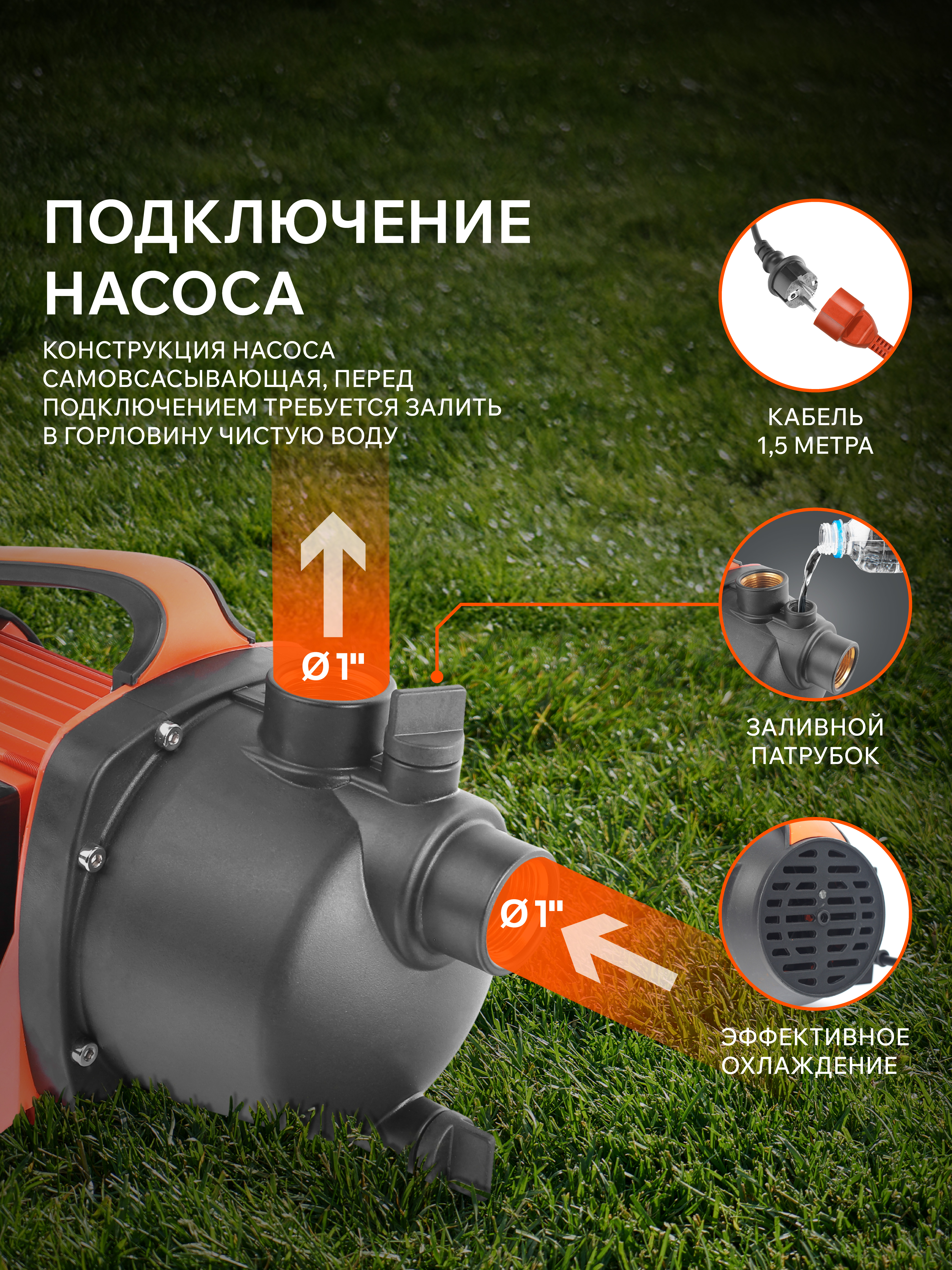 Конструкция насоса самовсасывающая, для запуска необходимо заполнить рабочую камеру и всасывающий трубопровод водой.