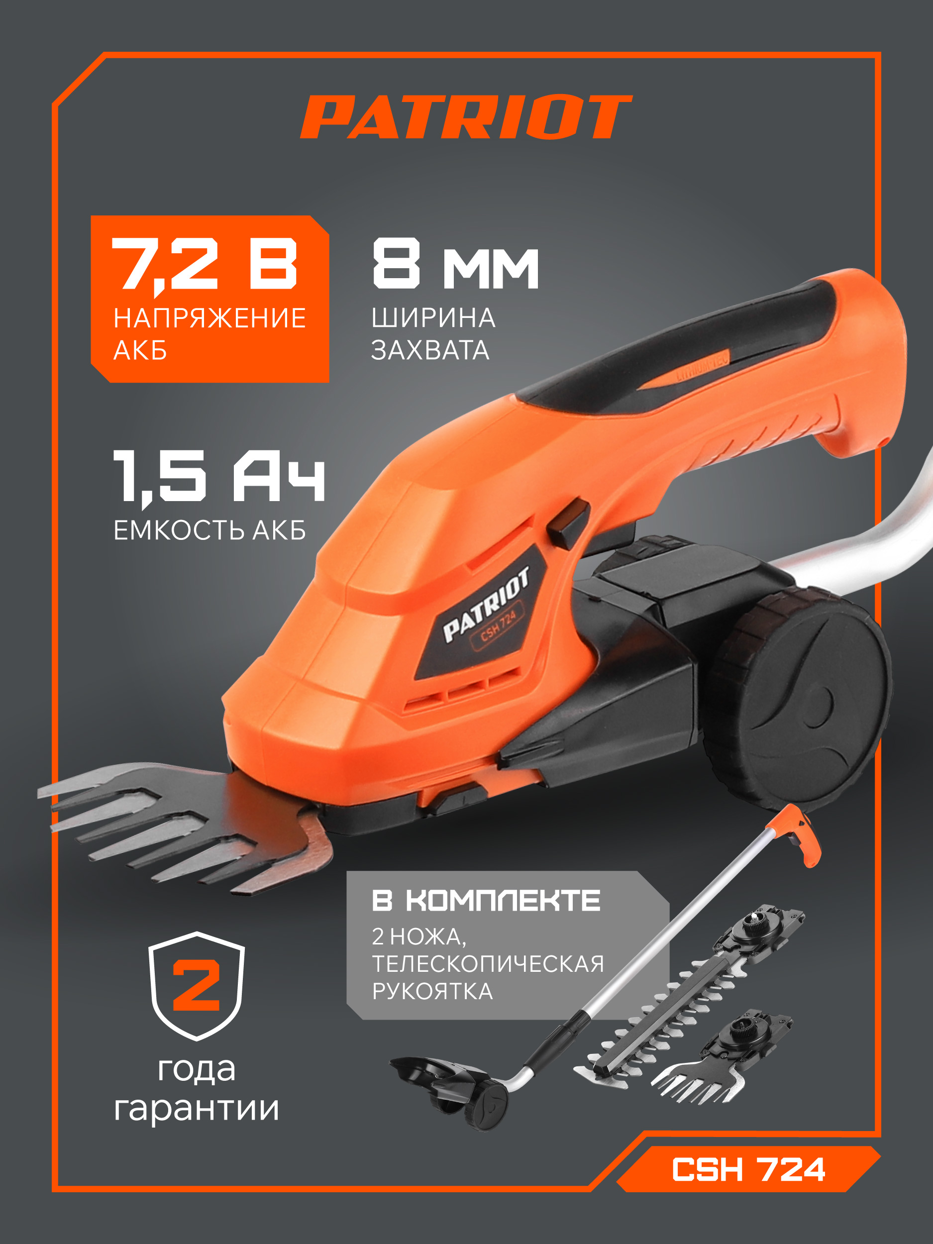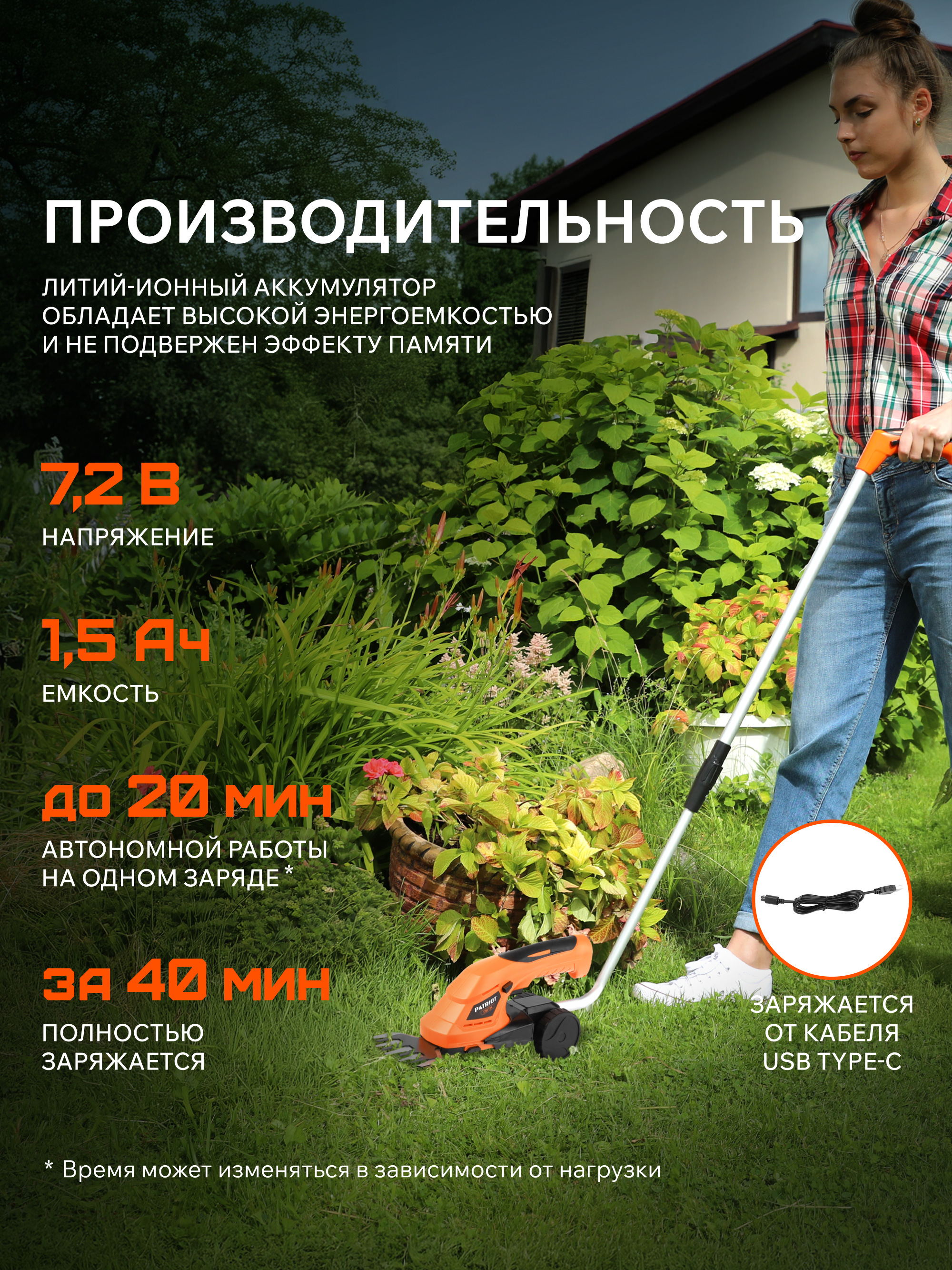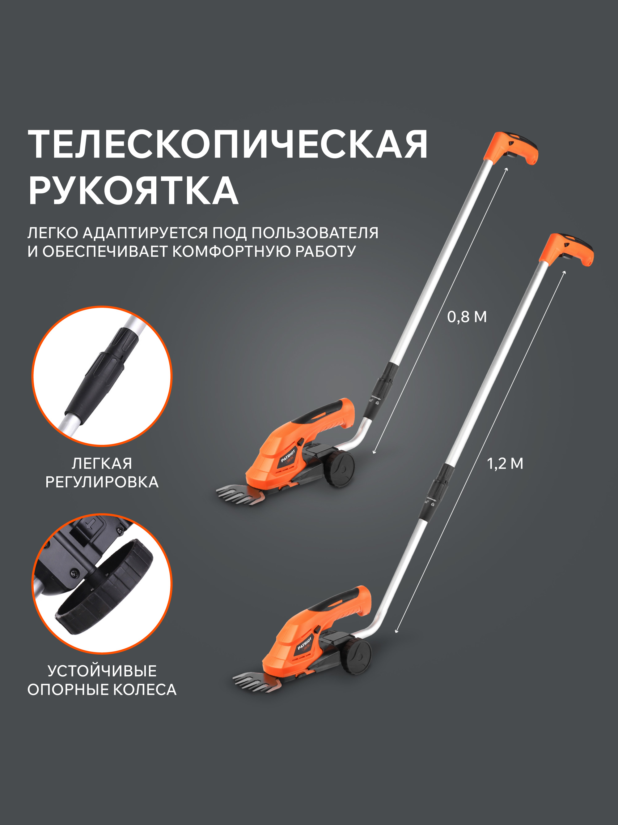 Ножницы-кусторез аккумуляторные СSH 724 – удобный инструмент для стрижки газона рядом с клумбами и дорожками, подрезания поросли на декоративных кустарниках. Удлиненное лезвие позволит без труда добраться к кустарникам с мощной и низкой кроной. Ножницы справятся с побегами крыжовника, малины, хвойниками. Прорезиненная рукоятка снижает уровень вибрации при работе. Ширина насадки для травы 90 мм, длина ножа для кустарников 170 мм. На одном заряде аккумулятора работают до 20 минут. Время полной зарядки аккумулятора до 40 минут. Для еще более комфортной работы в комплект поставки включена телескопическая штанга на роликах. (Телескопическая штанга используется только с установленной насадкой "ножницы")