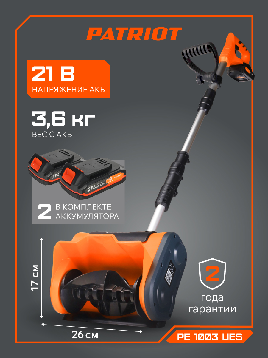 Аккумуляторная лопата-снегоуборщик PATRIOT PE 1003 UES для очистки дорожек на приусадебных участках или городских дворах. Телескопическая рукоятка позволит без труда убрать инструмент в небольшой шкаф или в багажник легкового автомобиля. Шнек выполнен из пластика, не оставляющего царапин на декоративных покрытиях участка. Для питания используется аккумулятор системы UES.