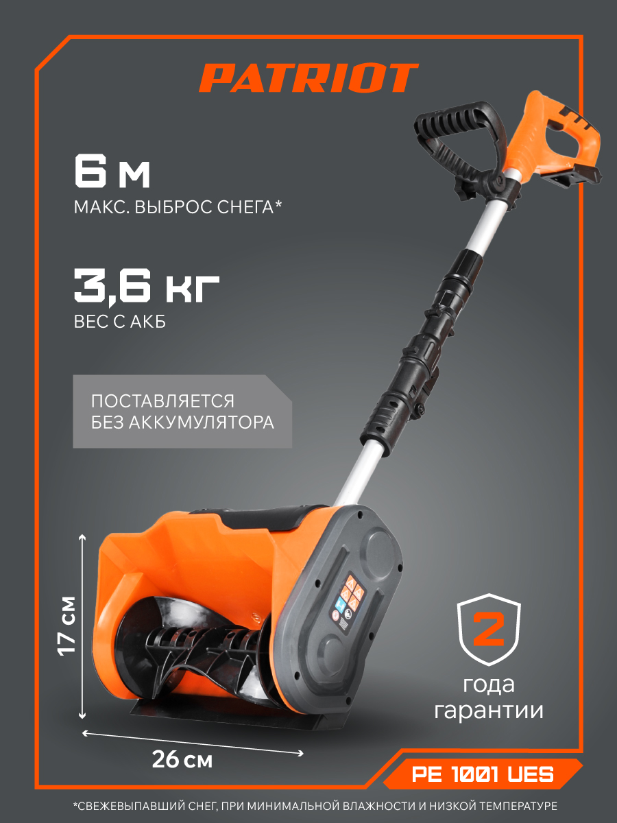 Аккумуляторная лопата-снегоуборщик PATRIOT PE 1001 UES для очистки дорожек на приусадебных участках или городских дворах. Телескопическая рукоятка позволит без труда убрать инструмент в небольшой шкаф или в багажник легкового автомобиля. Шнек выполнен из пластика, не оставляющего царапин на декоративных покрытиях участка. Для питания используется аккумулятор системы UES. Аккумулятор и зарядное устройство приобретается отдельно.
