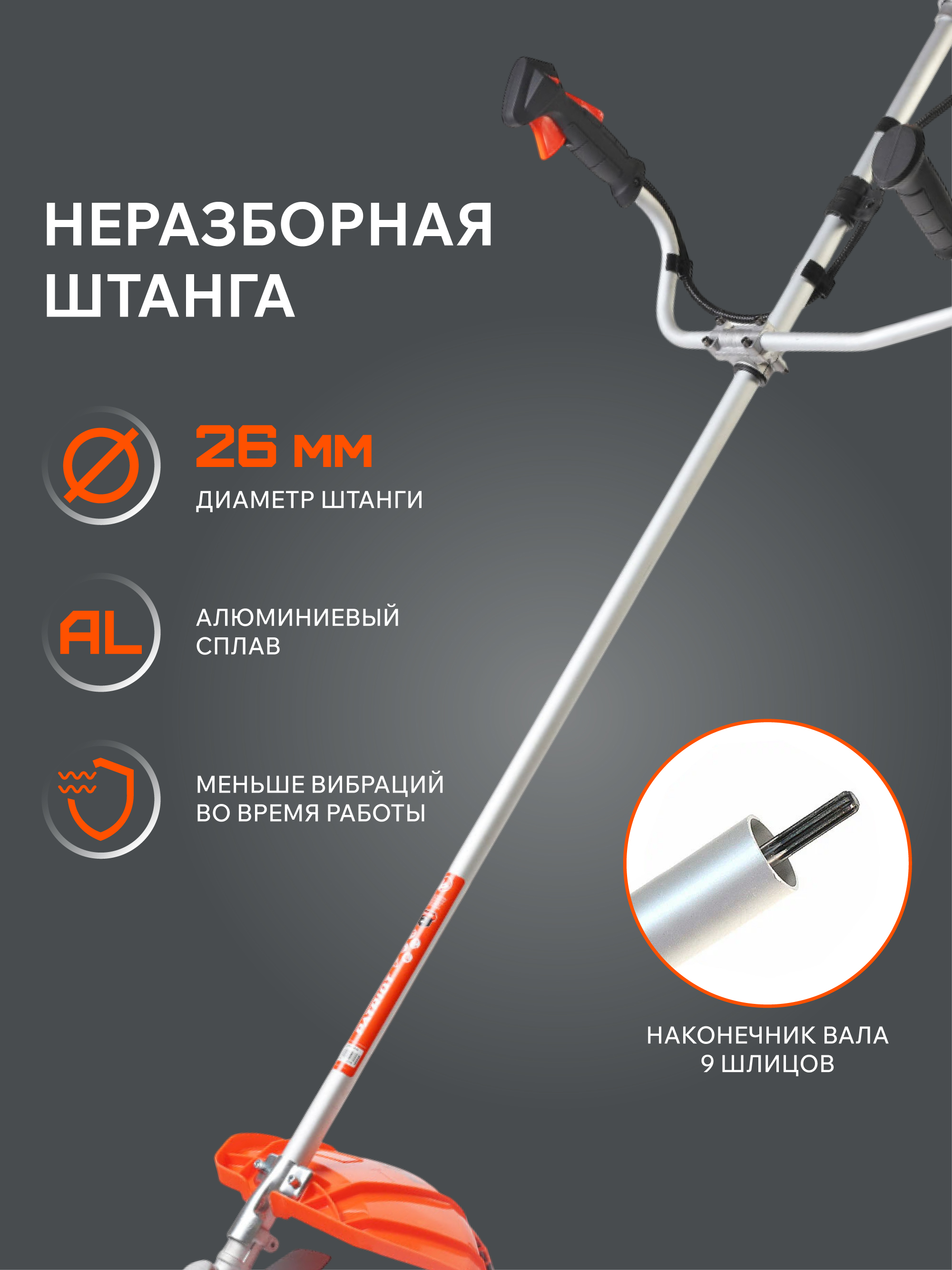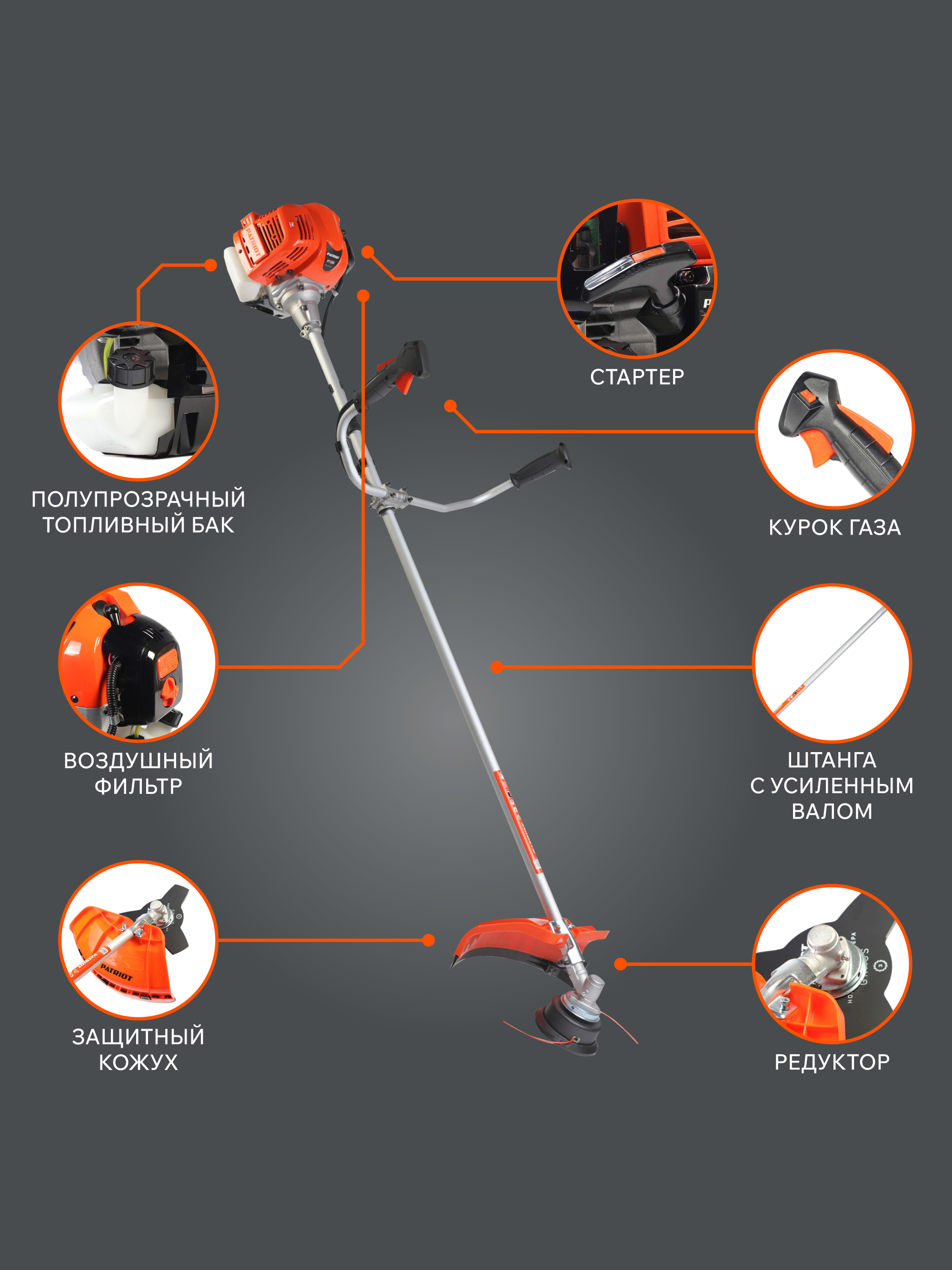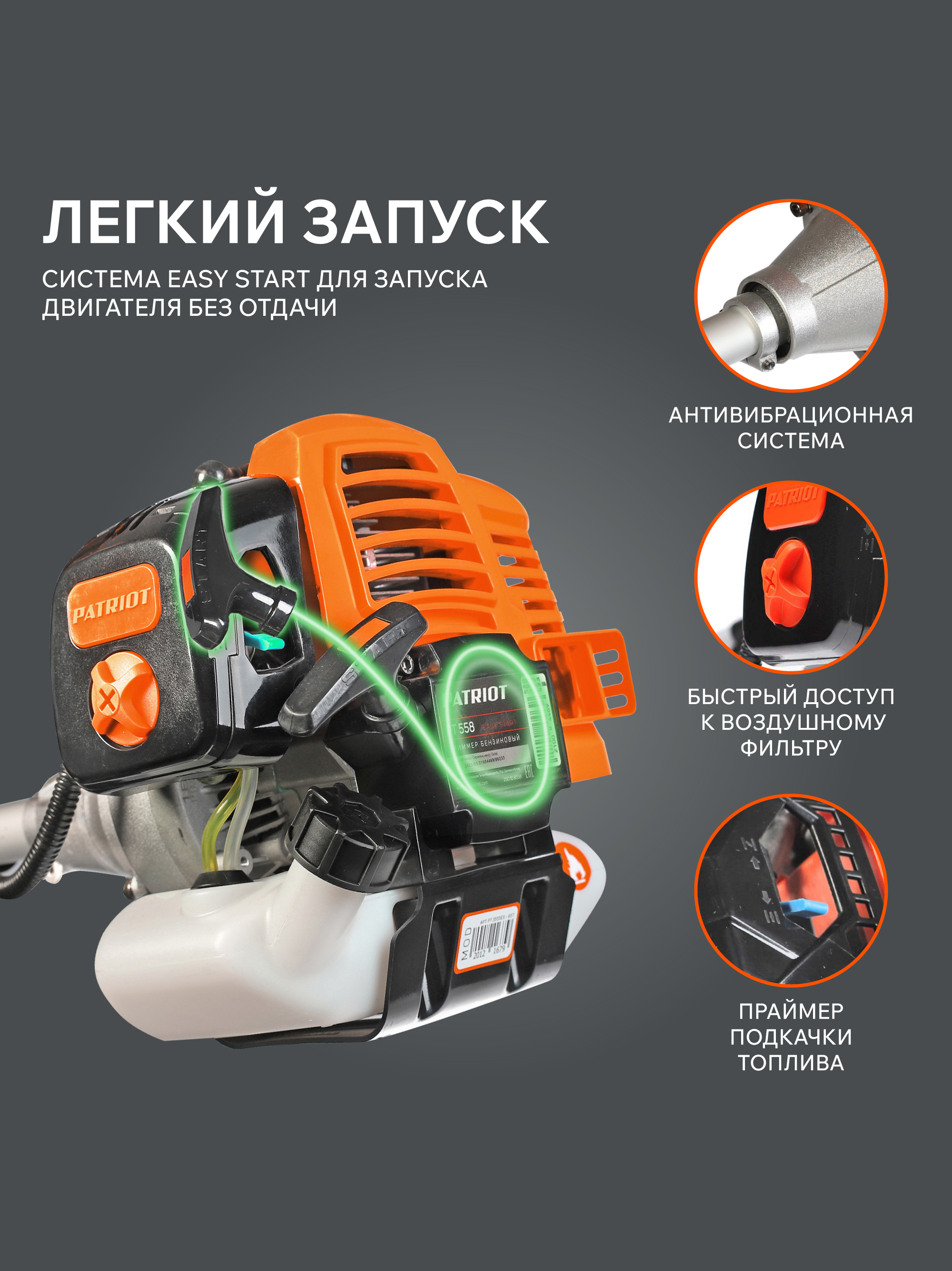 Мощный универсальный триммер РТ 558 с регулируемой велосипедной рукояткой предназначен для скашивания густой травы на неровных, больших площадях. Обладает современным дизайном, усиленным корпусом двигателя, жестким трансмиссионным валом. При замене лески на режущий нож применяется для скашивания сухостоя, жестких сорняков и небольших кустарников. Обладает высокой производительностью и отличнным тяговым усилием. Триммер оснащен эргономичным плечевым ремнем. Передовая система антивибрации, сбалансированная конструкция обеспечат удобство при эксплуатации. Все элементы управления встроены в эргономичную рукоятку. Благодаря праймеру осуществляется легкий старт, а системе Easy Start - плавный легкий запуск без рывков. Легкий доступ к воздушному фильтру и свече зажигания позволяет проводить регулярное техническое обслуживание без необходимости обращения в сервисный центр. Применение запатентованных масел и смазок снижает вредные выбросы в атмосферу.