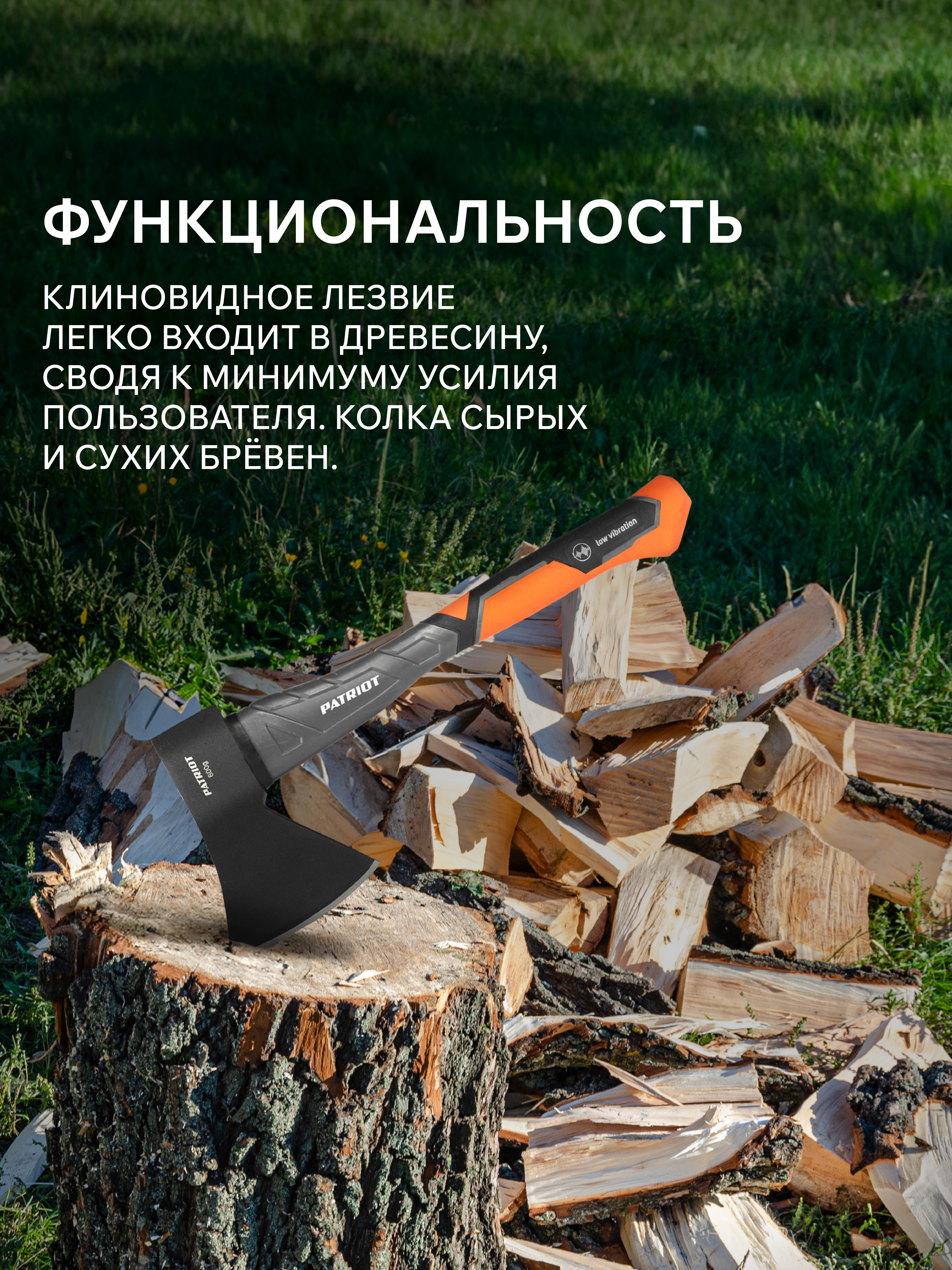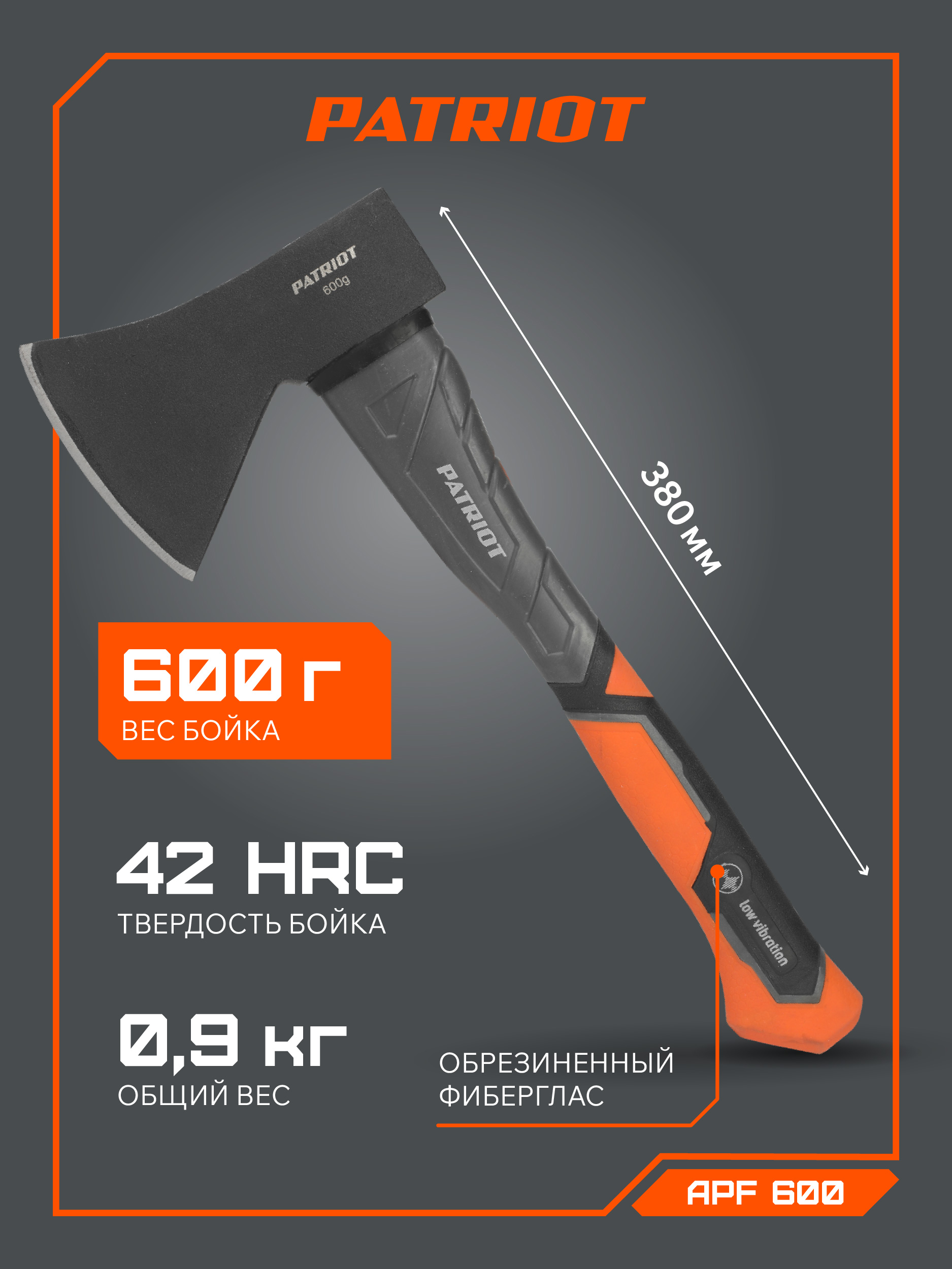 Топор универсальный плотницкий PATRIOT APF 600 для рубки небольших деревьев и ветвей. Клинок выполнен из закаленной стали с антикоррозийным покрытием. Фиберглассовая прорезиненная рукоятка не скользит в руках и гасит вибрации от ударов.