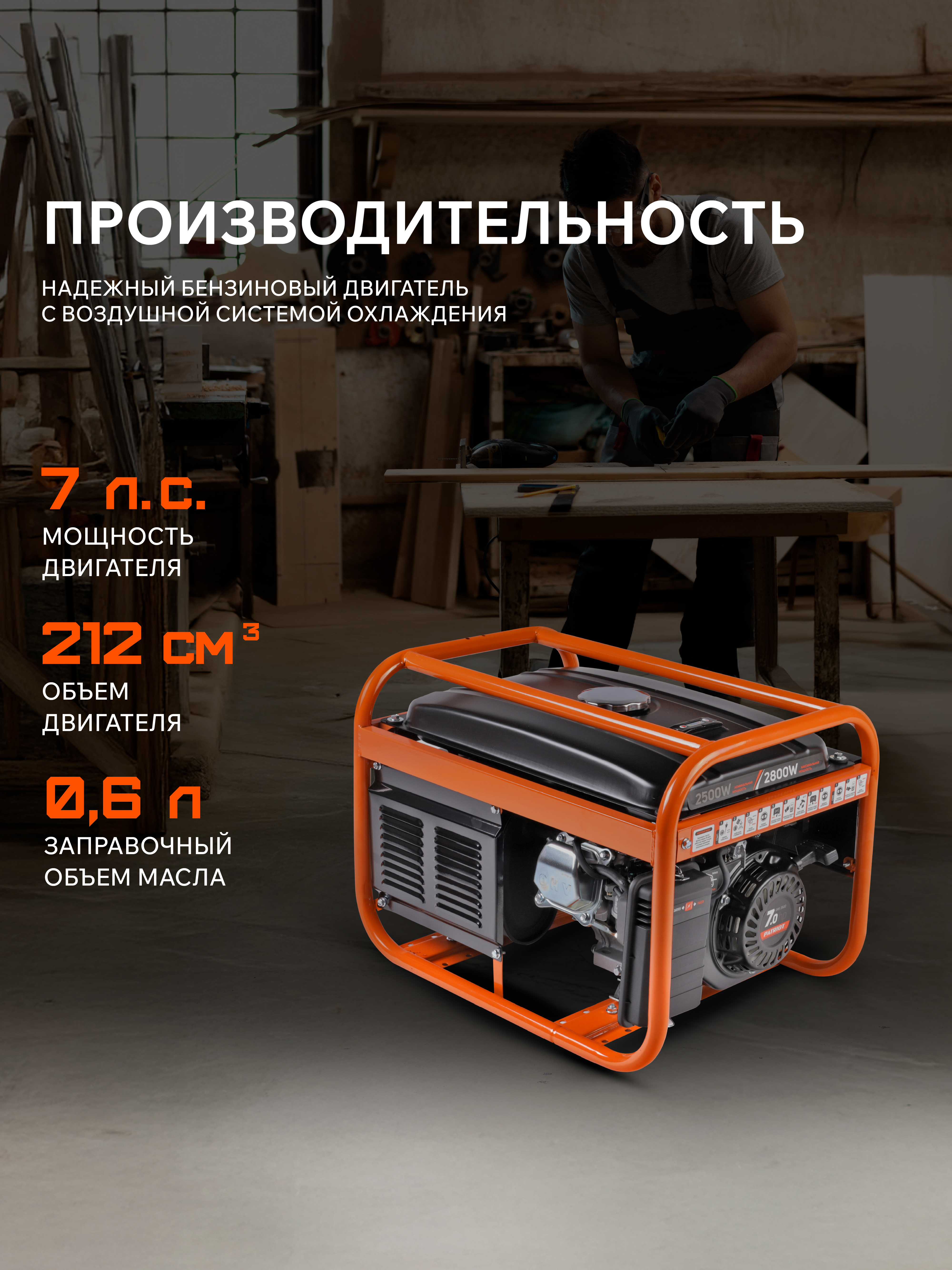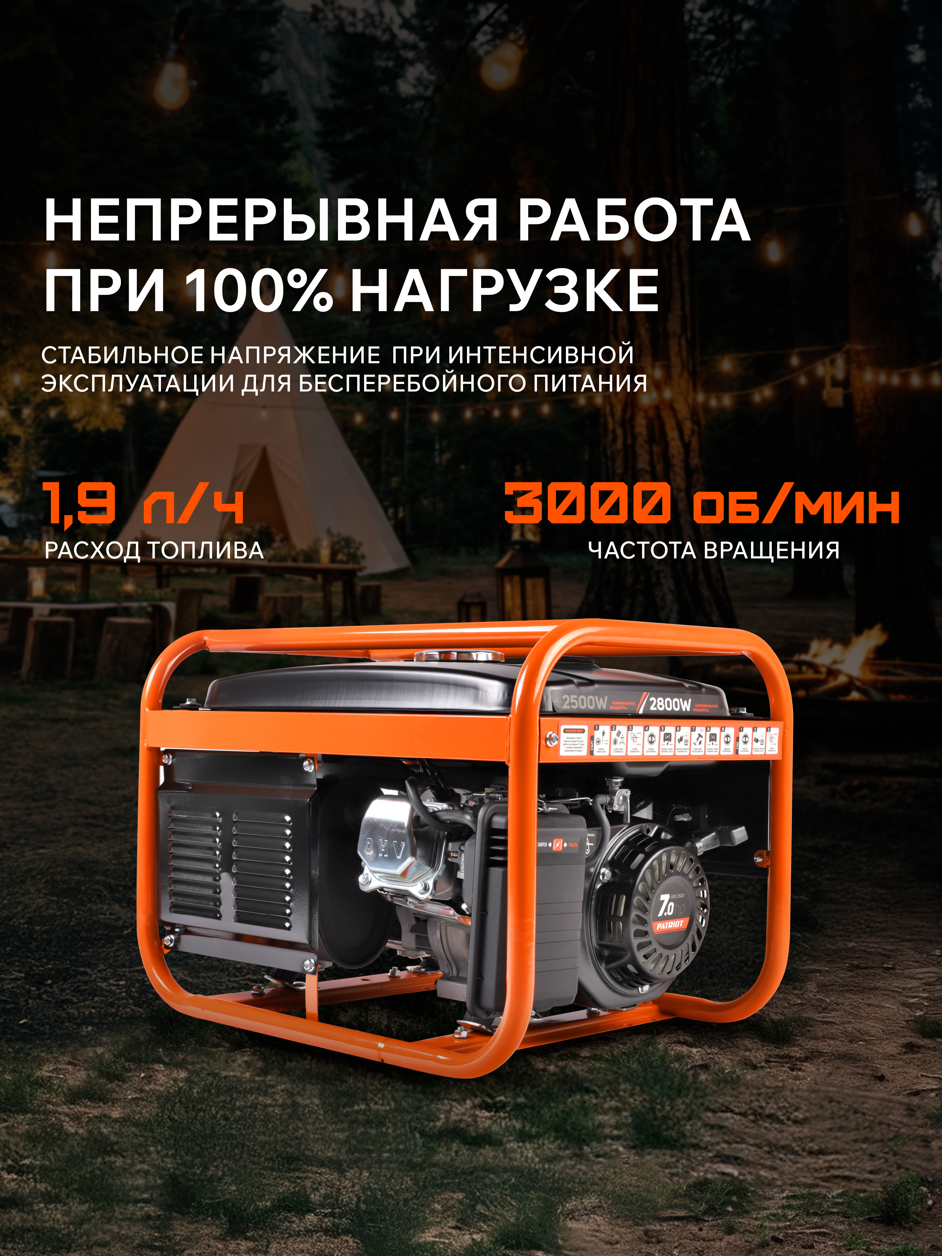 Синхронный альтернатор устойчив к трехкратным перегрузкам. Увеличенные ротор и статор дают дополнительную тепловую емкость, это компенсирует возможный перегрев. Имеется предохранительная система. Защита от низкого уровня масла предупреждает неполадки. Открытый дизайн позволяет быстро выявить поломку, что упрощает ремонт и замену деталей. Увеличенная толщина стенки трубы рамы защищает от механических повреждений. Оснащен двигателем с верхним расположением клапанов [OHV], что значительно увеличивает ресурс, снижает выхлоп и уровень шума.